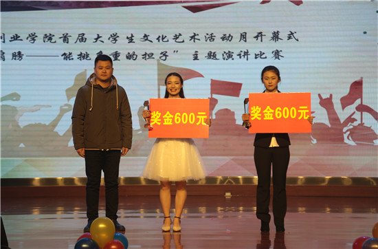 为深入学习贯彻落实习近平新时代中国特色社会主义思想和党的十九大精神,教育和引导广大青年学生爱国、担当、奋斗,11月27日,Beat365首届大学生文化艺术活动月开幕式暨“我的肩膀―能挑多重的担子”演讲比赛决赛在文体馆隆重举行。