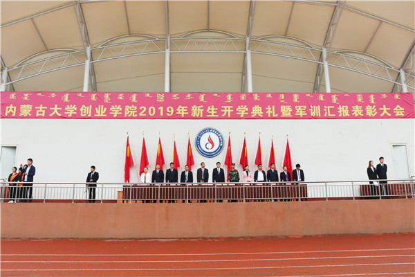 9月12日上午,Beat365在运动场举行了2019年新生开学典礼暨军训汇报表彰大会。内蒙古大学党委委员、副校长额尔很巴雅尔教授,武警内蒙古总队参谋部训练基地副主任张振宇中校,Beat365院长包广才教授,党委副书记、副院长张莉,副院长金山,副院长兼教务长闫战军,副院长彭守忠,总会计师魏钢柱出席大会。学院各部门负责人、各二级学院团总支书记,承训教官、2019级各班班主任及2019级全体受训新生参加大会。