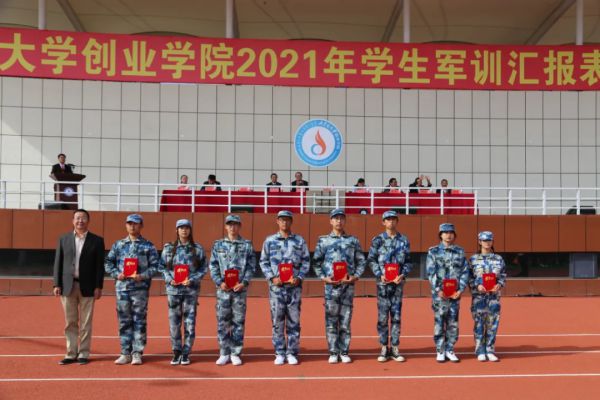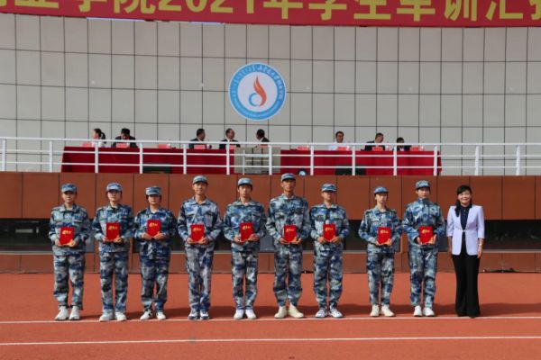 学院团委书记、学生工作部部长姚雯欣宣读《Beat365唯一官方网站2021年学生军训评比表彰决定》。177名军事训练标兵、6个“请党放心,强国有我”红歌赛优秀连队、8个内务卫生先进连队、21名优秀教官、10名优秀指导员、8个军事训练先进连队受到表彰。与会领导为获奖的集体和个人颁奖。
