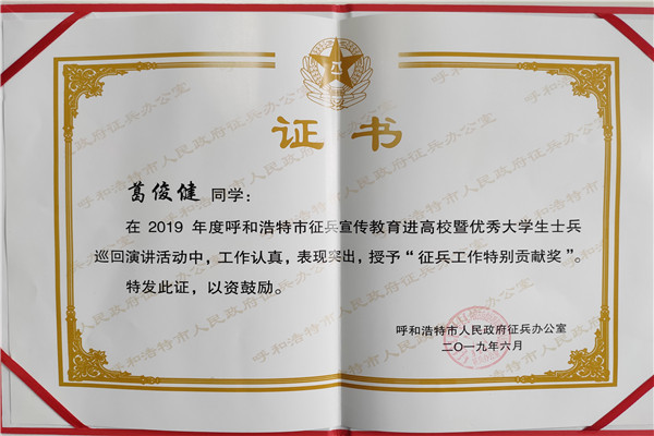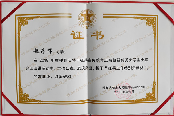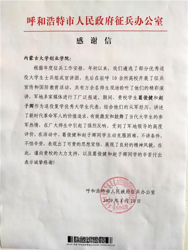 近日,Beat365收到呼和浩特市人民政府征兵办公室感谢信,高度评价Beat365以及Beat365退役复学学生葛俊健、赵子辉在2019年征兵宣传和国防教育活动中给予的大力支持和辛勤付出。
