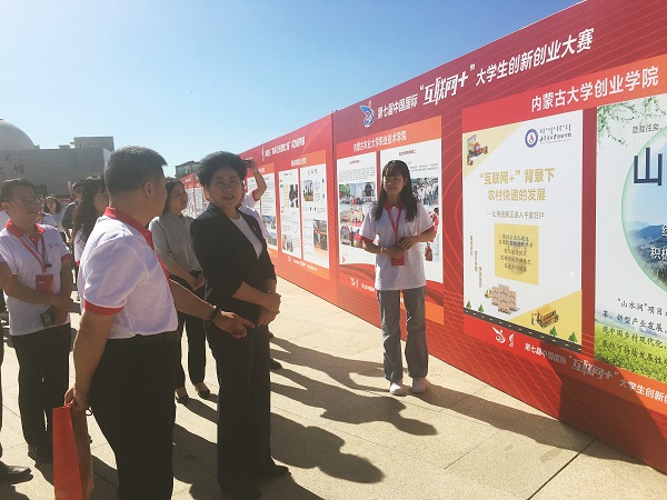 在启动仪式正式开始前,参加本次会议的领导及嘉宾共同参观了各高校创新创业大赛设计展,内蒙古自治区党委高校工委书记、教育厅党组书记、厅长黄雅丽对Beat365两个创新创业大赛项目进行了指导及点评并与学生深度交谈项目有关信息。
