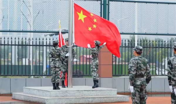 上午9时,伴随着雄壮的国歌声,五星红旗冉冉升起,军训汇演正式拉开帷幕。