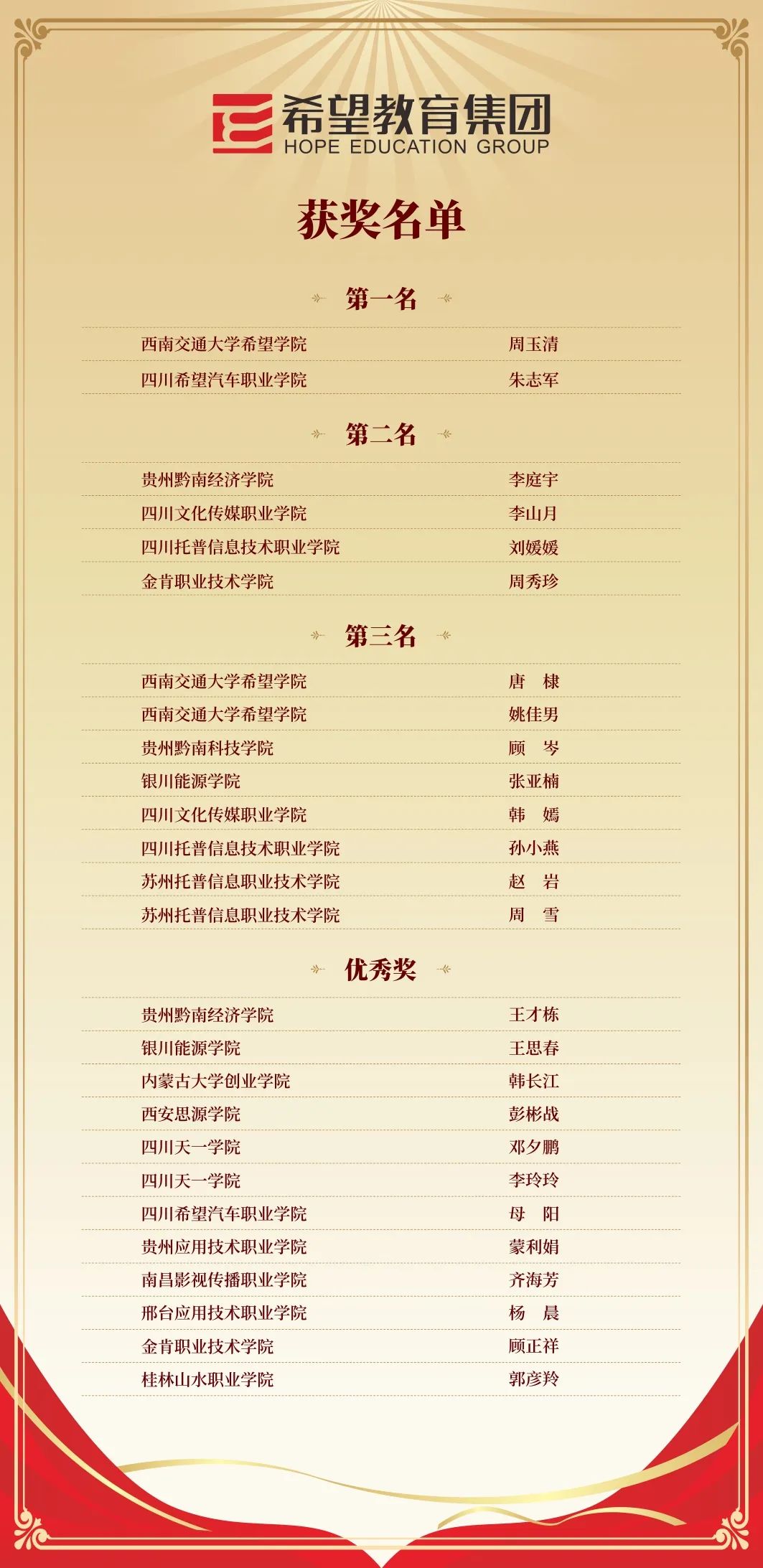 10月11-12日,希望教育集团在贵州黔南经济学院举办“凝心立德 创新树人”首届党组织书记讲立德树人活动。来自17所院校的26位交流选手以分组交流、现场研学等形式展示各院校讲立德树人的活动成果,分享各院校落实立德树人根本任务的有效经验。西南交通大学希望学院周玉清、四川希望汽车职业学院朱志军斩获活动一等奖。