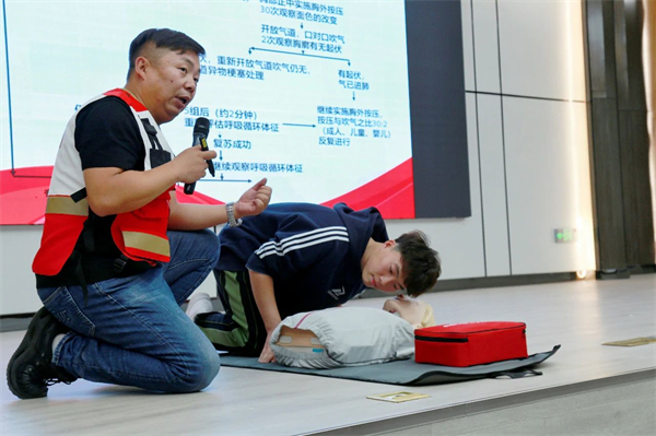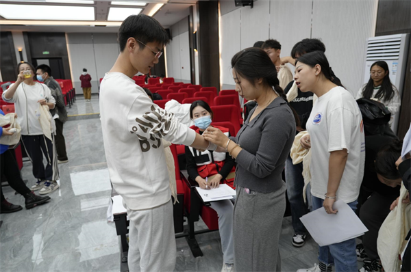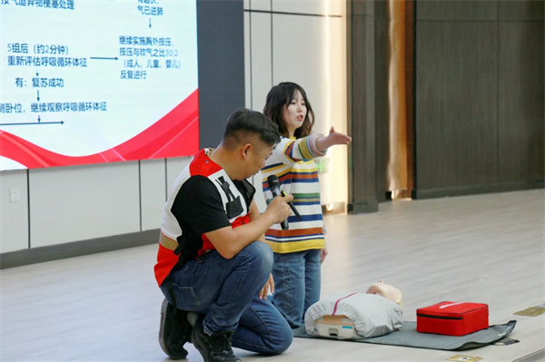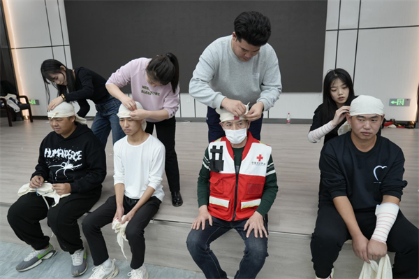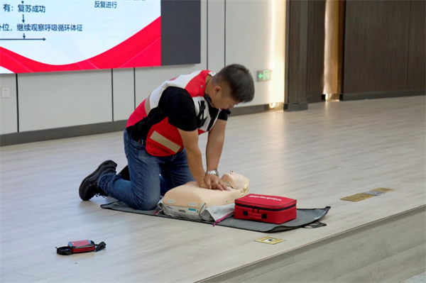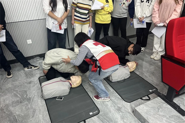 实操训练中,红十字会老师分组指导,重点对清理口腔异物、开放气道、胸外心脏按压、人工呼吸等环节的操作要领和流程进行了细节讲解和示范。参训师生在培训老师的带领下积极参与模拟训练,利用人体模型反复练习并掌握了徒手心肺复苏(CPR)的流程及操作要领,利用绷带、止血带等教具掌握几种常见创伤急救措施。
